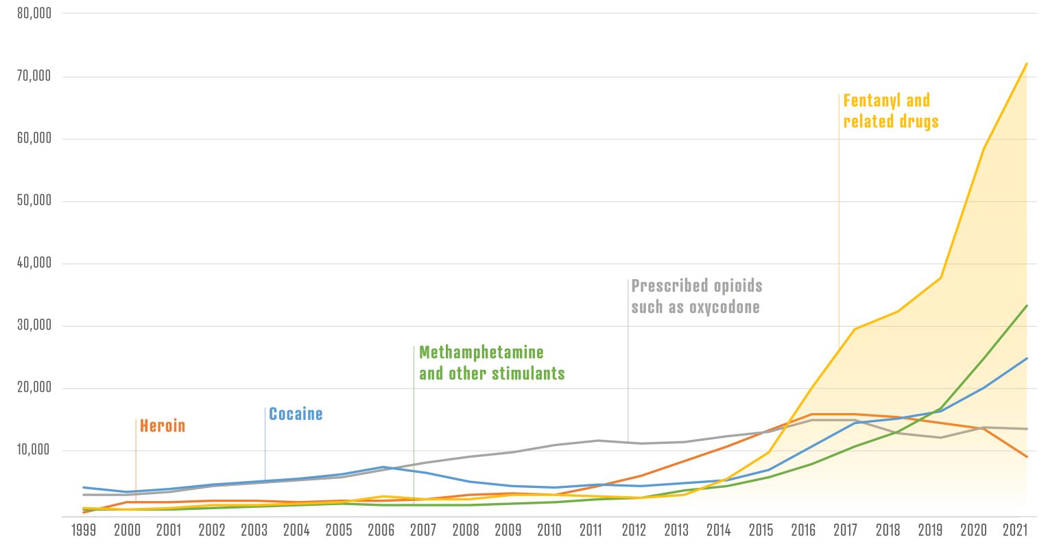 The United States leads the world in overdose deaths, particularly from opioids. Over the past five years, 500,000 Americans have died from overdoses, at least 200,000 from fentanyl alone. The death toll from fentanyl alone surpassed the combined deaths from the Vietnam and Korean wars.