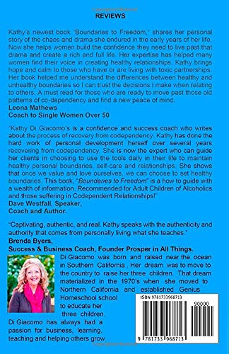 In “Boundaries to Freedom” you will learn how to set healthy boundaries that will bring feelings of freedom to your life. You will gain confidence and empowerment to live the life you have always wanted. Learn how to filter and detach from the accusations, blame and degrading comments that are verbally directed at you. Shift negative responses from toxic relationships to hope of repair. Attract relationships where you can be yourself without being criticized or ridiculed. Thats FREEDOM! Attract relationships that are welcoming and pleasurable. Recover from sadness, depression, and hopelessness in your current relationships. Learn from Kathy’s frightening story and instructions for how to implement healthy boundaries to break the chains of insecurities and fears that has taken her from disappointment and abuse to empowerment and freedom to be who she was always meant to be. In the book, you get a helpful list of healthy and non-healthy boundaries to print out. This list gives you a quick reference to use when you are being bombarded by someone verbally abusing you. The list will show you how to know a healthy boundary from an unhealthy one. Learning to have healthy boundaries is an exciting adventure, an exercise in personal liberation. It means coming to know yourselves and increasing your awareness of what you stand for. Gain self-acceptance knowing that you are OK as you are and worthy of the good things in life.